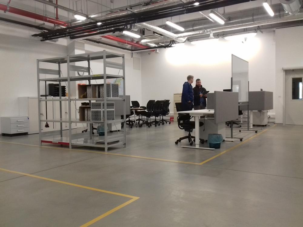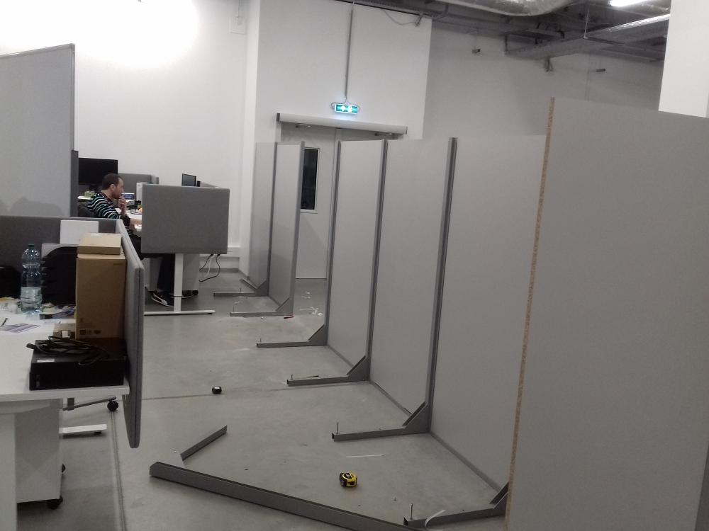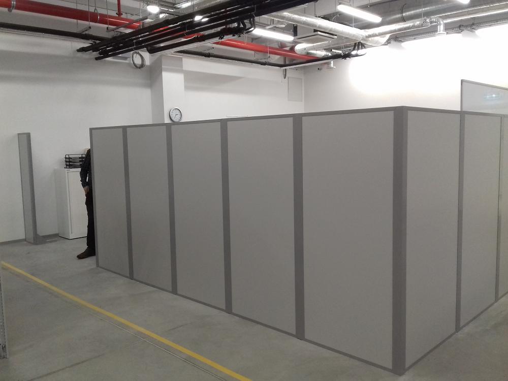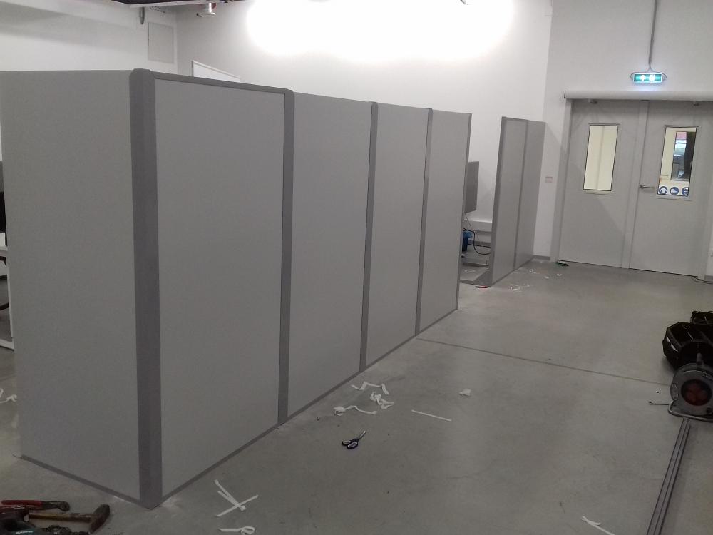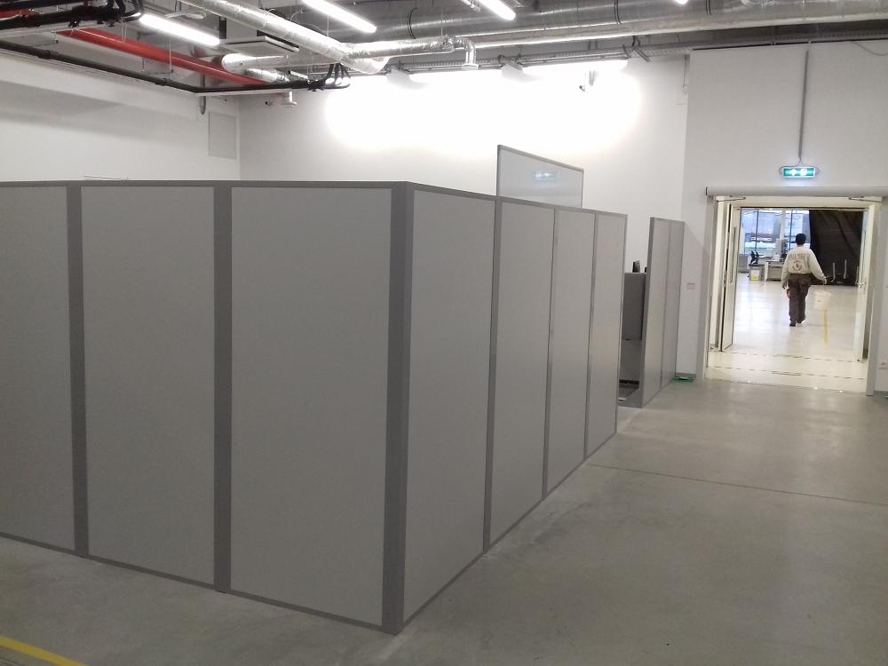 A raktárhelyiségben kialakított irodai munkahelyek védelme miatt egy hangárnyékoló paravánt építettünk a kijelölt terület köré. A paraván elsődleges feladata a munkahelyek elkülönítése volt, a hangárnyékoló szerep nem volt kiemelten fontos, azonban egyes, megfelelően elhelyezett munkahelyek esetében a zajcsillapítás is jelentős volt.